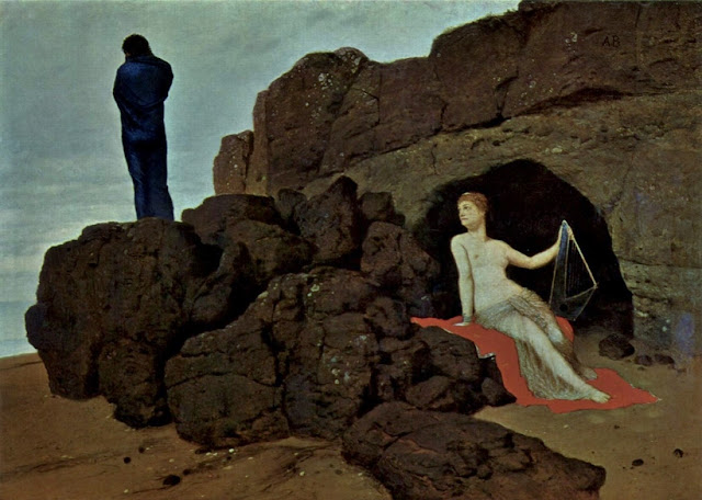 Mercurio obbedisce e, a volo, giunge ad Ogigia, dove la ninfa abita in una grotta, circondata da alberi e da fiori con strani uccelli e limpide acque scorrenti. Il Dio è accolto ospitalmente a banchetto, ma quando comunica l'ordine di Giove, Calipso si sdegna contro la crudeltà dei Numi, che non le permettono di amare un mortale; comunque obbedirà, giacché non può essere altrimenti.